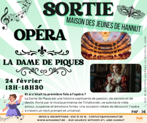 Et si tu découvrais l’opéra autrement ? Tu penses que l’opéra, ce n’est pas pour toi ? On va te faire changer d'avis en te faisant découvrir La Dame de Piques. Une musique intense, une histoire pleine de mystère, de passion et de suspense, un lieu grandiose, une expérience atypique, idéale pour une première fois ! Départ : Avernas-le-Bauduin Carte membre obligatoire : 5€