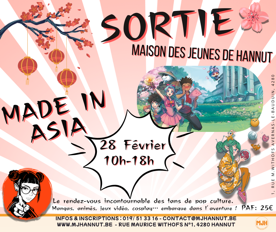 La Maison des Jeunes de Hannut t’emmène vivre une expérience unique au festival Made in Asia. L’événement incontournable pour tous les fans de mangas, d’animés, de jeux vidéo, de YouTubers et de cosplay !